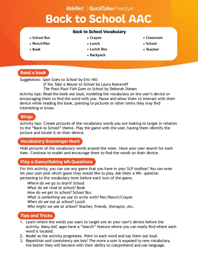 Activity tips: Read the book out loud, modeling the vocabulary on the userโs device or encouraging them to find the word with you. Pause and allow them to interact with their device while reading the book, pointing to pictures or other terms they may find interesting or know.