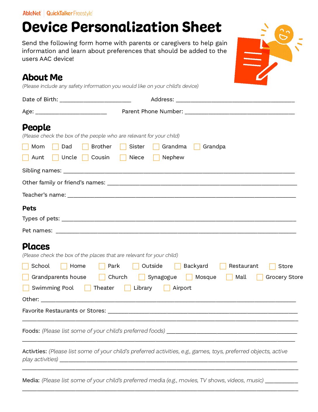 This simple personalization guide is designed to support both families and SLPs. For SLPs, you can send this home after a session, have the child and caregiver complete it together, and return it by the next visit so you can continue building a meaningful and motivating vocabulary set. For parents and caregivers, this handout can help you think through what would be most important to include on your child’s device. Collaborate with your SLP to learn how to add new words and decide where they should go.