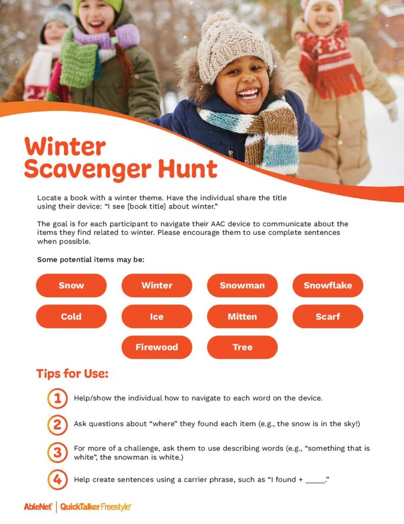 The goal is for each participant to navigate their AAC device to communicate about the items they find related to winter.