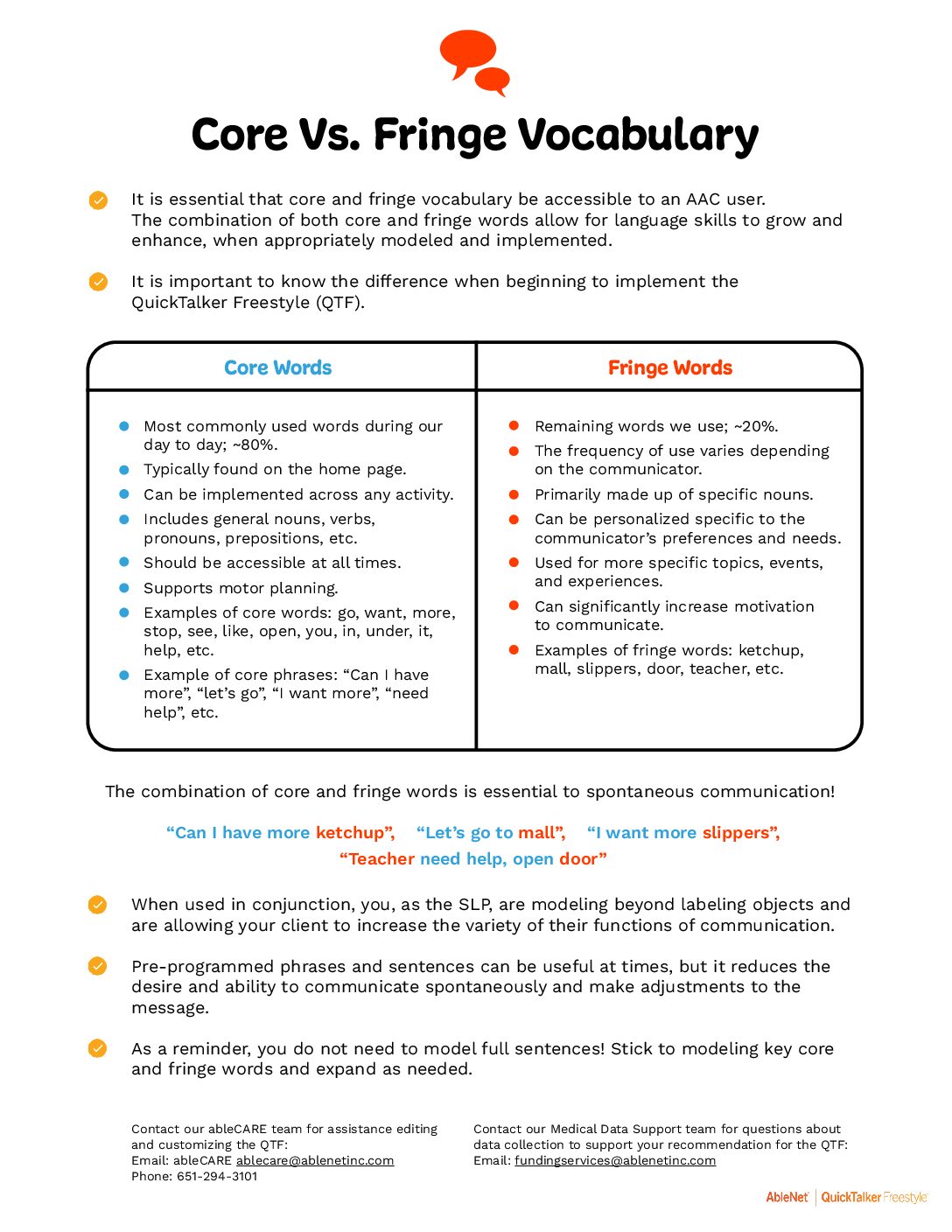 It is essential that core and fringe vocabulary be accessible to an AAC user. The combination of both core and fringe words allow for language skills to grow and enhance, when appropriately modeled and implemented.